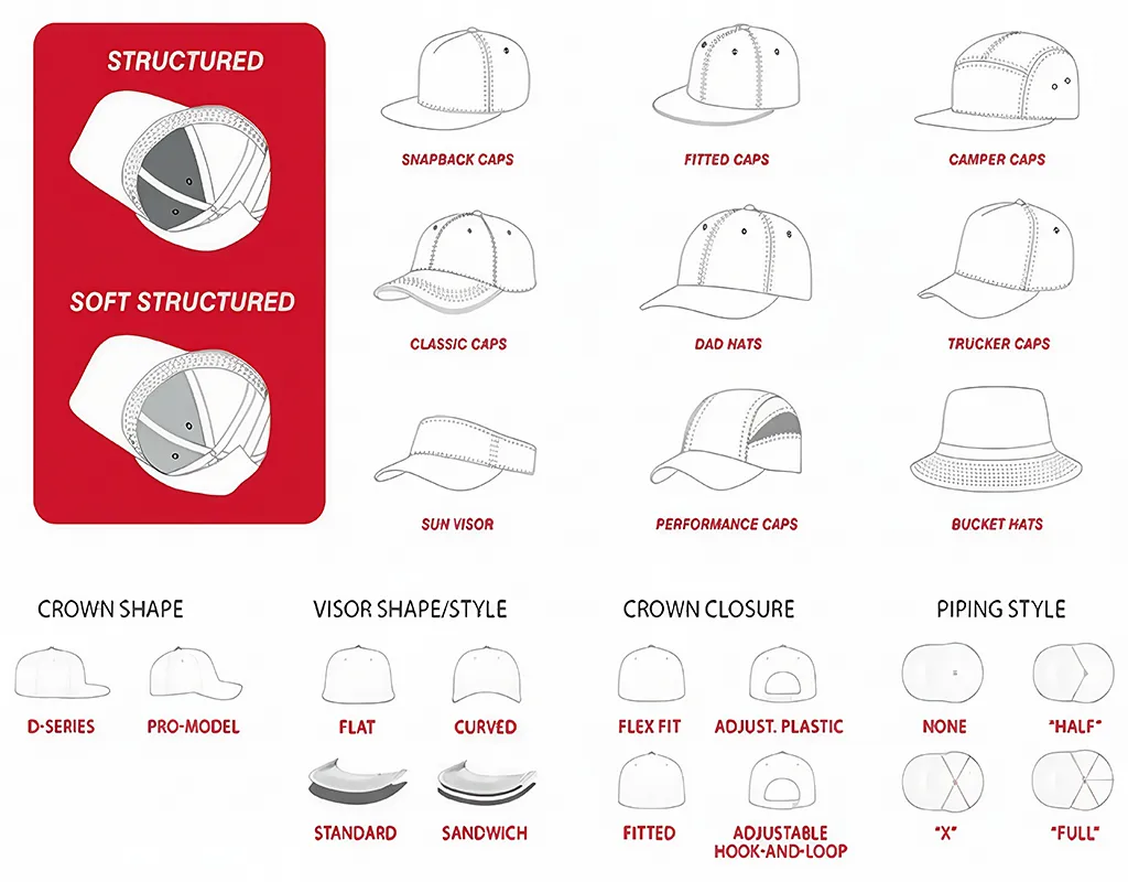 Select visor shapes, brim styles, closure options, and piping details that improve comfort and durability.
